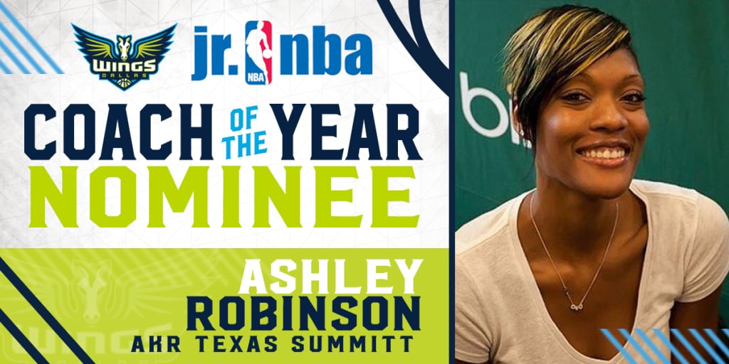 ARLINGTON, TX – Ashley Robinson was selected as the 2019 Dallas Wings Jr. NBA Coach of the Year today, announced Wings Director of Community Development Sean Alexander. As part of the selection process, Robinson will represent the Wings on a national level and go up against coaches nominated by WNBA and NBA teams for Jr. NBA Coach of the Year.